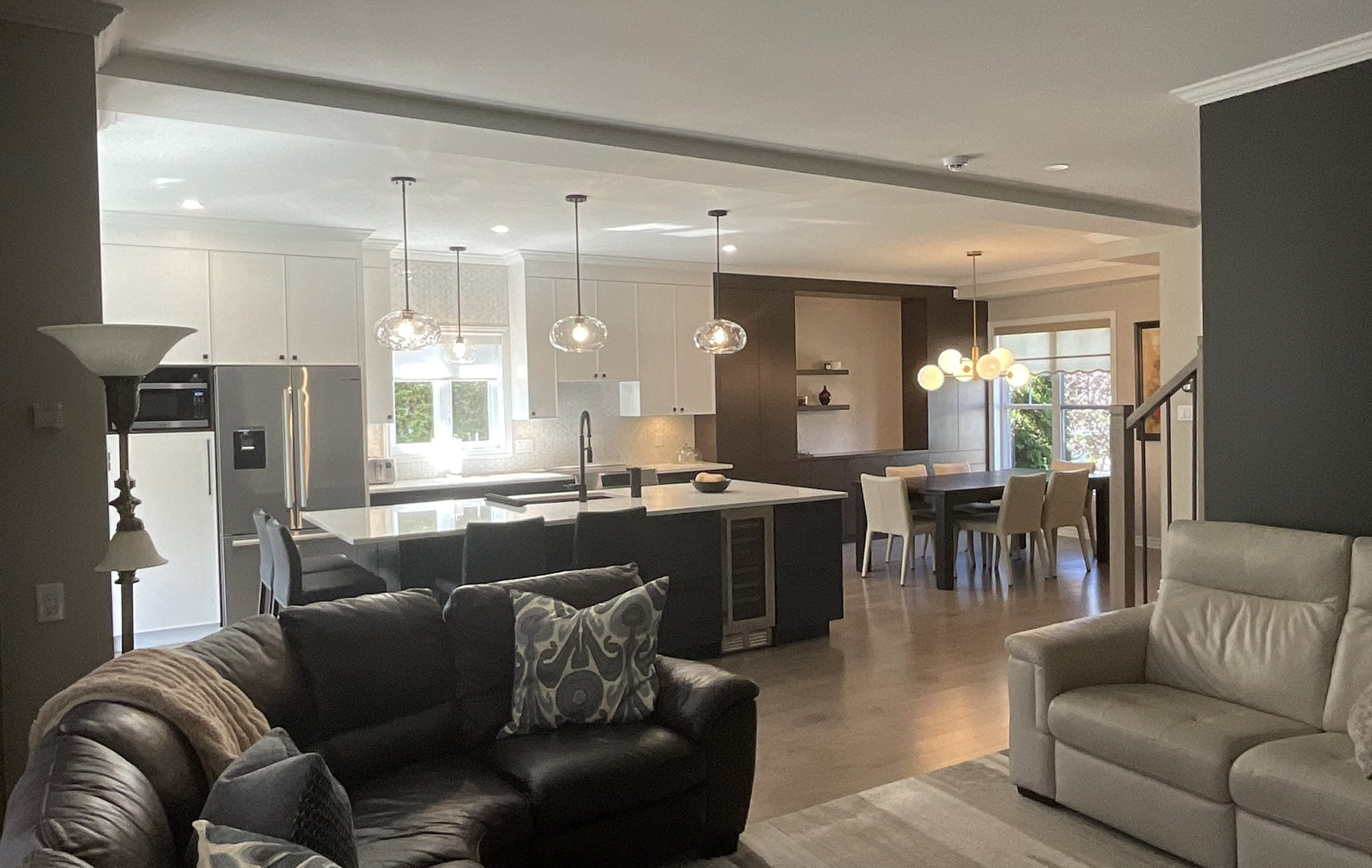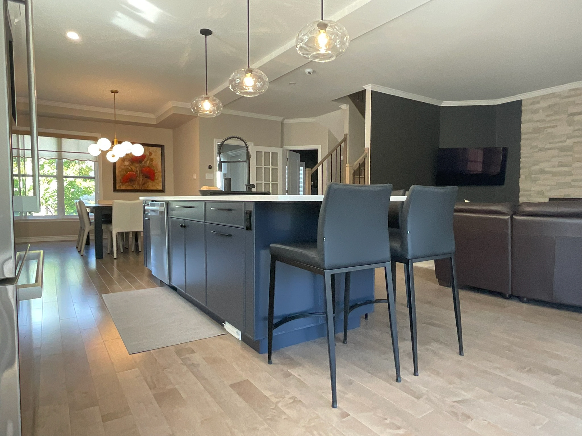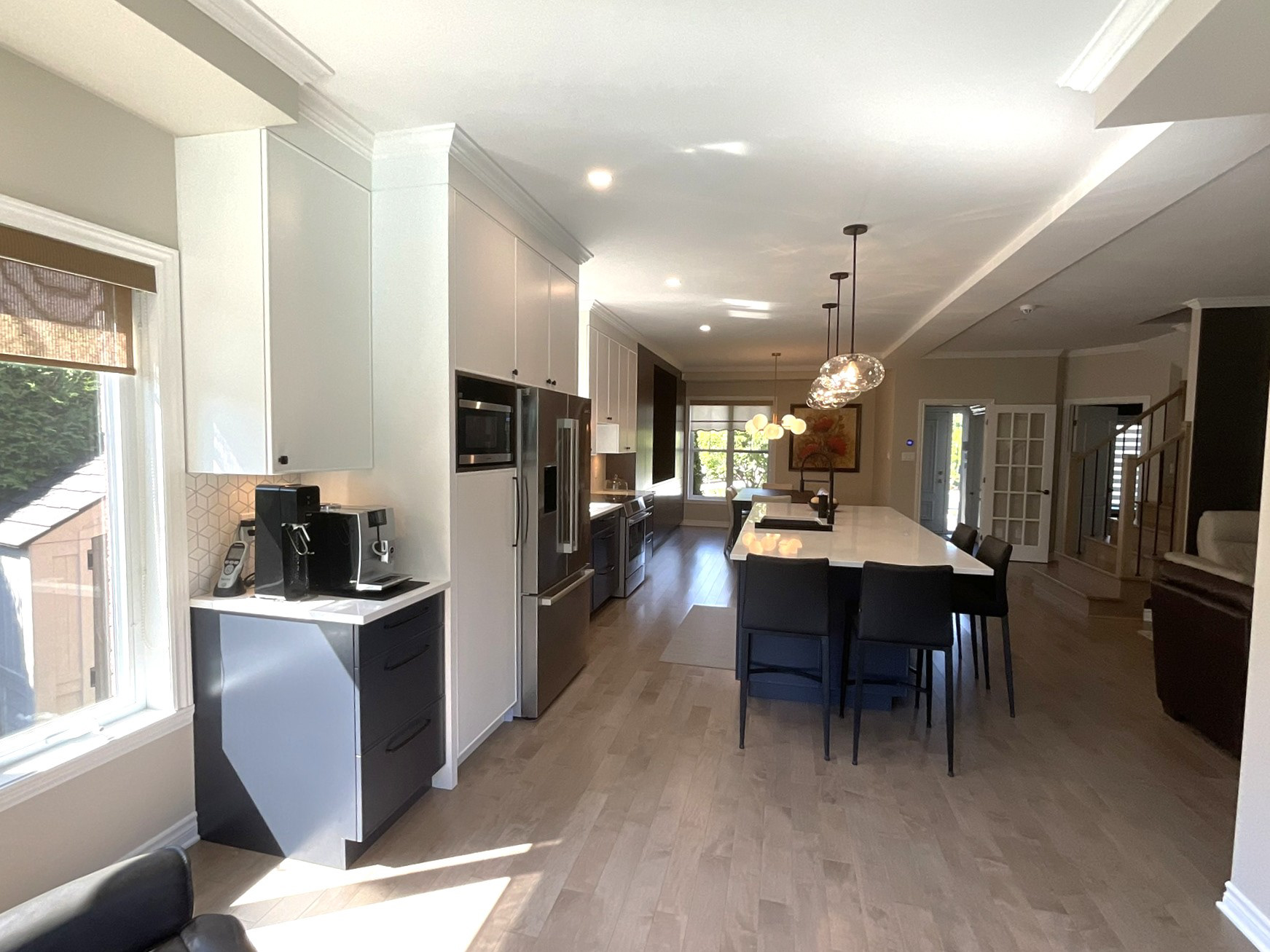 L’ajout d’un coin café et d’un cellier intégré dans l’îlot souligne le caractère fonctionnel de l’espace, tandis que le mur d’accent en noyer dans la salle à manger enveloppe la pièce d’une chaleur naturelle et luxueuse.