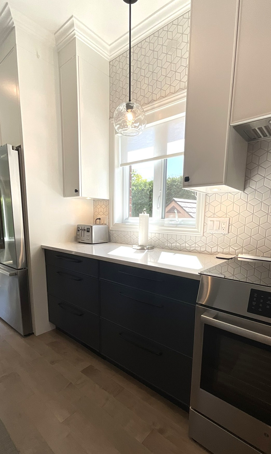 Le mariage du blanc pur et du bleu marine profond confère une allure intemporelle et raffinée, rehaussée par des détails noirs mats et un éclairage suspendu en verre soufflé qui ajoute une touche de modernité.